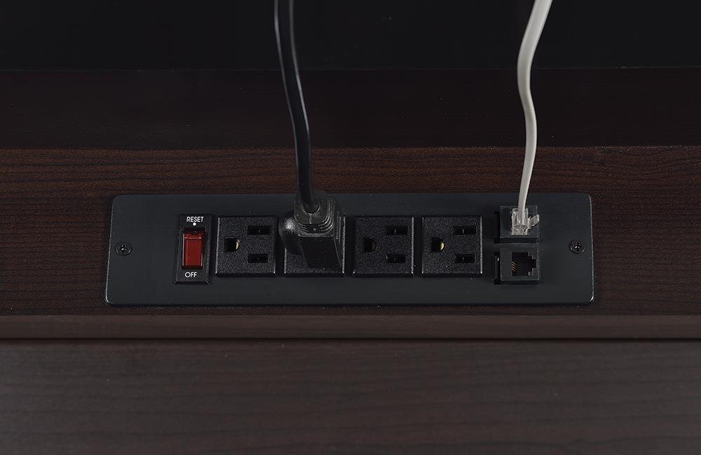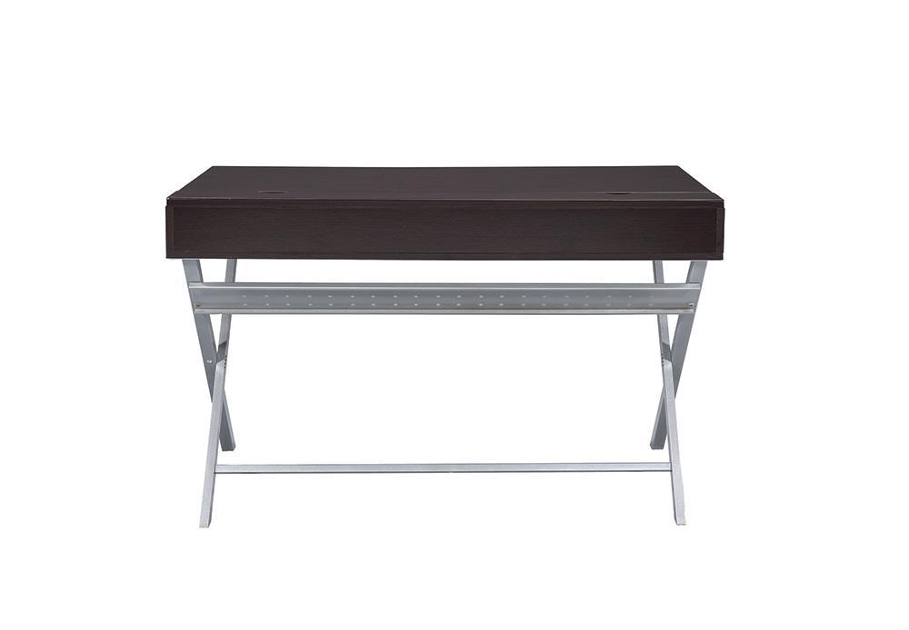 Keep your office supplies and devices organized and within reach without taking up too much valuable space This compact writing desk features a power storage compartment with convenient wire management to keep your electronics charged at all times with two storage drawers and an open compartment for other office essentials Finished in rich cappuccino with brushed silver legs this piece would make an attractive addition to any workspace