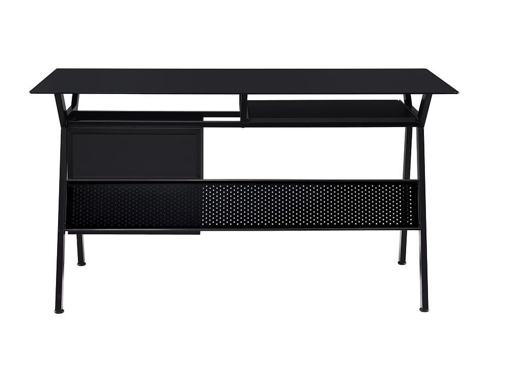 With a sharp and simple look this computer desk is the perfect way to keep your home office looking sleek and simple Two spacious storage drawers make organization easy and the sliding keyboard drawer saves space when not in use With plenty of surface area this desk is great for working on large projects or using multiple computer monitors