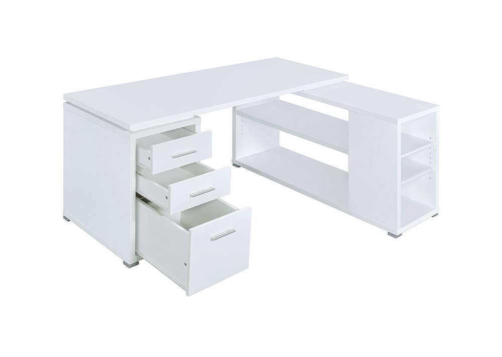 Have you been searching for a home office desk with tons of storage This set from the Yvette Collection might be just the thing you need This white Lshaped desk features a threedrawer module that includes a file cabinet On the other side expansive open shelves offer enough room to put together a small personal library Use this as a computer desk writing desk or a handy space for working on crafts