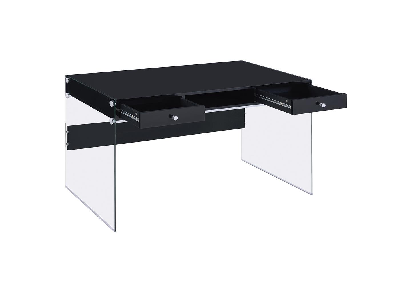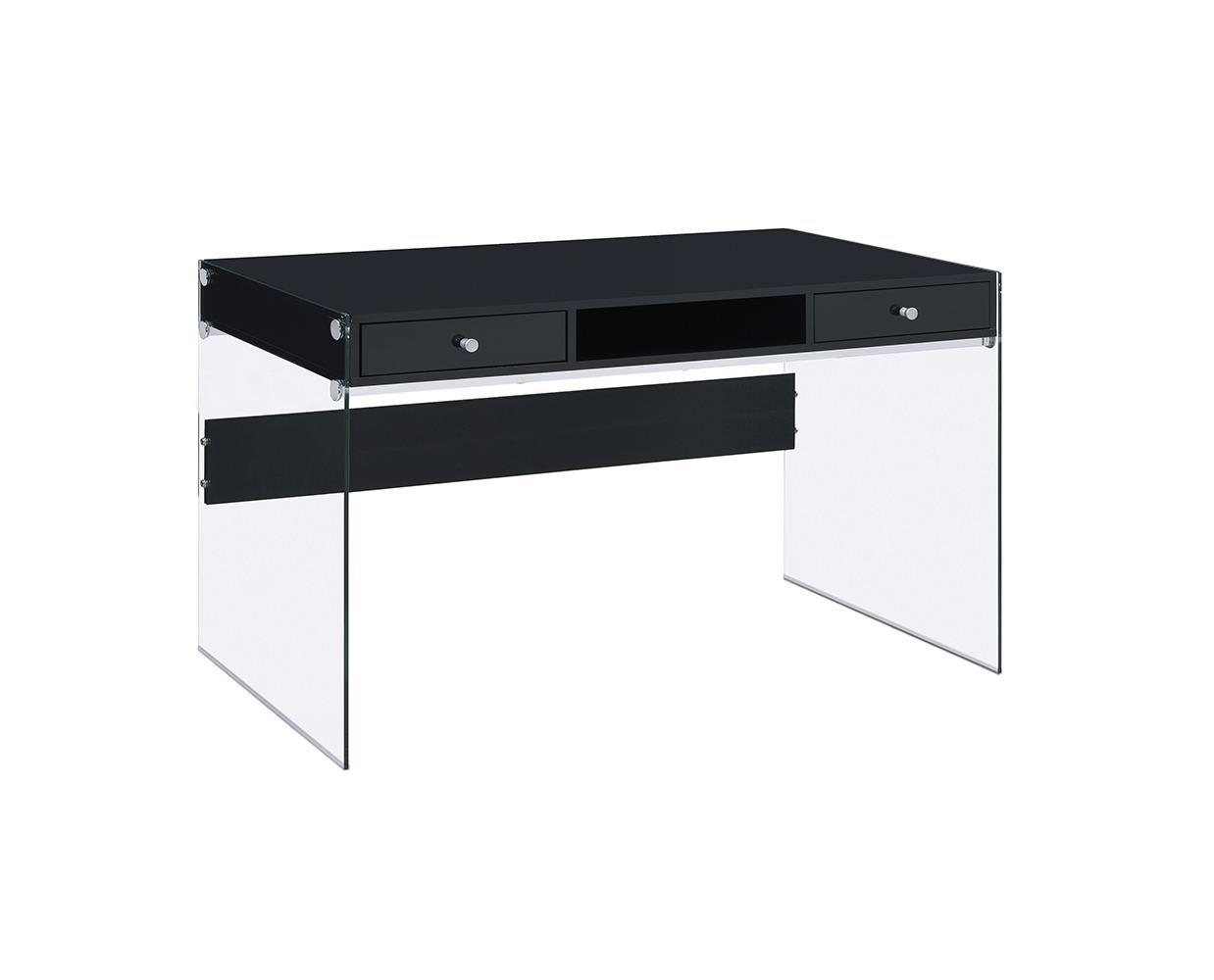 This contemporary writing desk will offer no distractions when it comes to getting your work done Constructed from glass MDF particle board and engineered veneer this desk features thick clear tempered glass side panels and a glossy black desktop This desk features an open center compartment and two drawers to hold those extra pencils and pens This desk is also available in a weathered grey and glossy white finish