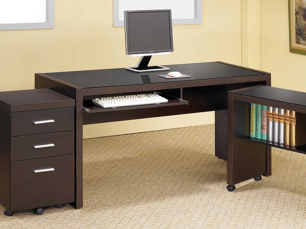 This contemporary desk will demand respect in your office setup With a rich cappuccino finish this desk offers clean lines and silver metal accents A keyboard desk drawer is also included for a functional way to type at your computer This desk can be paired with its matching extension for an L shaped setup