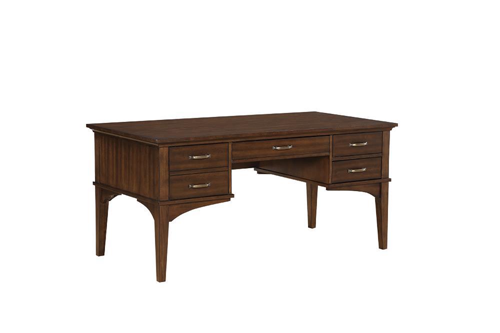 The Craftsman Golden Brown Office Desk features a simple classic design with antique brass hardware to complement any home office With a keyboard drawer and three storage drawers this desk enables you to organize and store paperwork books and office supplies Top drawers are fully lined in felt and all three feature full extension glides for easy access to contents