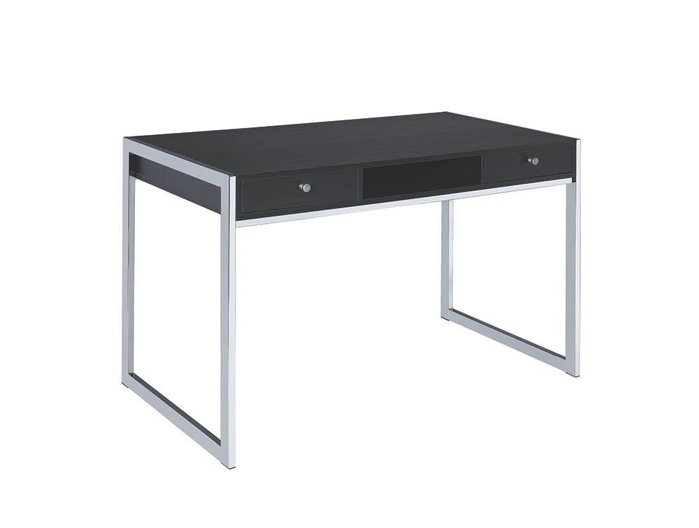 This sleek and modern writing desk will be the perfect spot to get your work done Constructed with steel MDF particle board and engineered veneer this desk is finished in a dark grey with a chrome steel frame This desk features an open center compartment and two drawers This piece is also available in a weathered grey finish