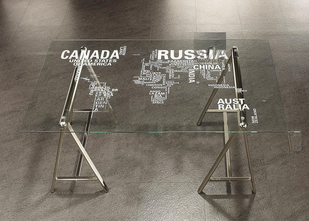 This writing desk sports a sawhorse design and a clear tempered glass top The clear glass features a printed world map that highlights countries in an artistic fashion The metal and glass combination along with artistic design elements make this desk a great centerpiece and conversation starter