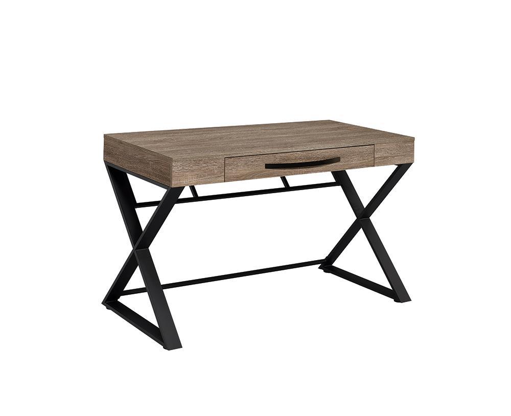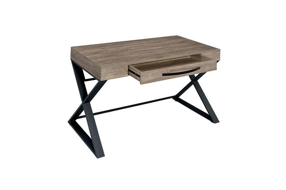 Modern writing desk in weathered taupe finish Metal frame with X details in sandy black finish add distinct look to unit Desk conveys simplicity with one 1 drawer Metal MDF particle board and laminate construction