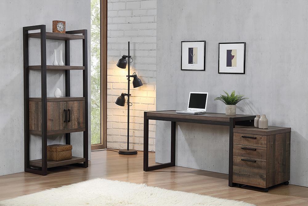 The Luke Weathered Oak Writing Desk features a rusticlooking laminate top that brings a warm look and exceptional durability to this pieces sharp modern design With its large desk top the piece offers a comfortable working area plus ample space for a computer books and decorative accents Combine with other pieces in the collection for added storage options and to bring a cohesive stylish look to your office space