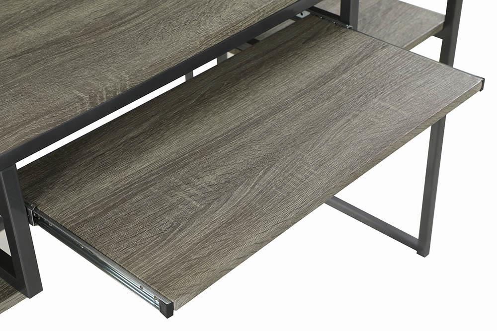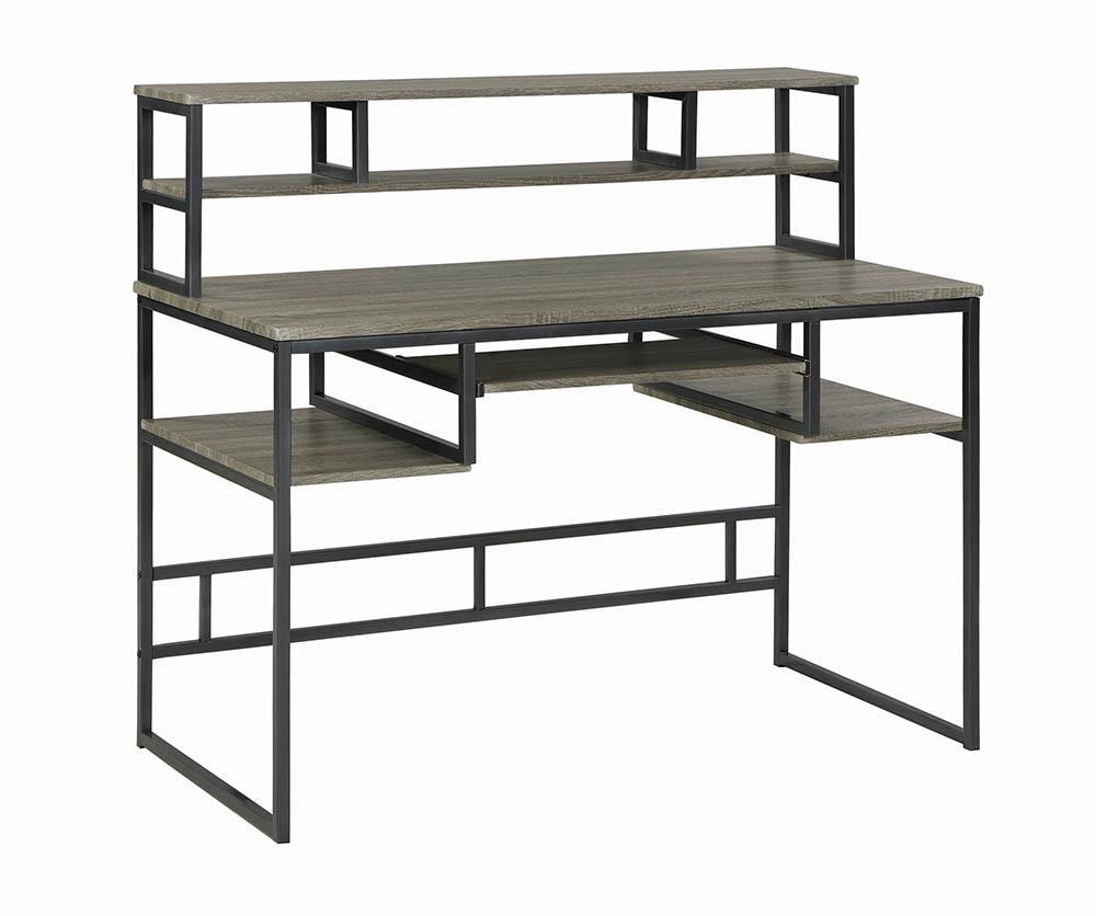 Computer desk in weathered taupe finish Industrial metal frame in gunmetal finish Keyboard tray minihutch with two 2 shelves and two 2 shelves under the desk allow for function and easy to reach storage Metal MDF and laminate construction