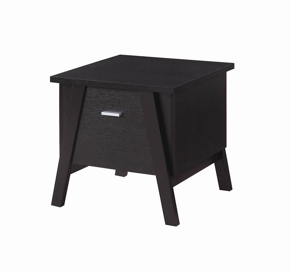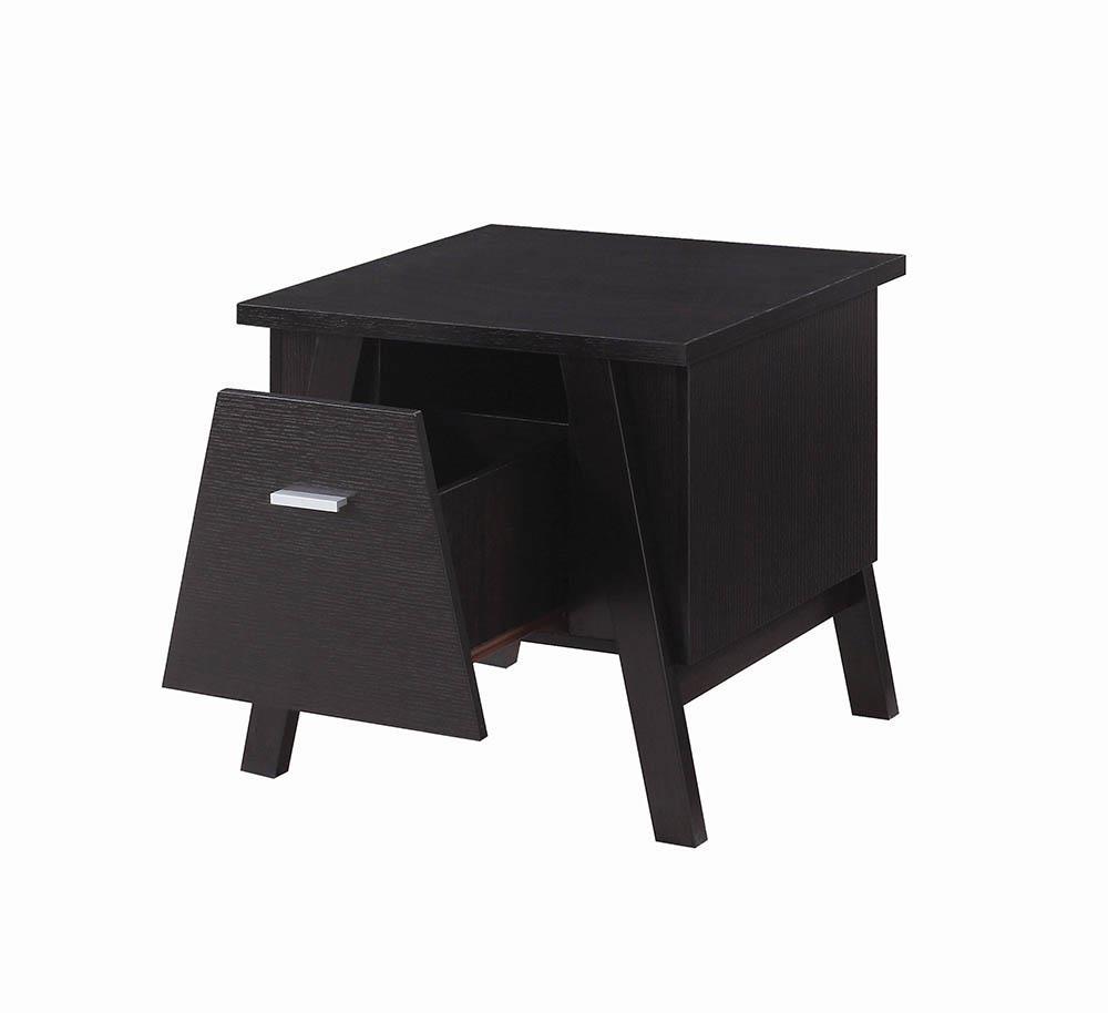 This modern end table features unique shapes to set it apart from the rest With a deep red cocoa wood finish this end table has one drawer in a beautiful angled shape Silver brushed hardware completes the look The angled legs pay tribute to the inspiration from an earlier decade