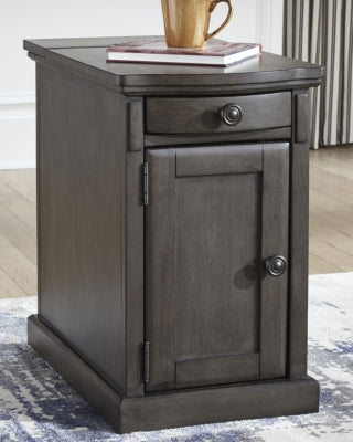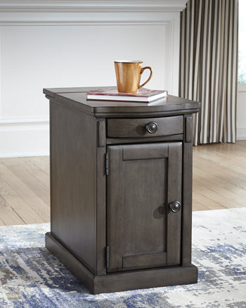 So much form and function in a beautifully compact piece of furniture This richly styled chairside end table puts it all within reach including a flipup top panel revealing a power portperfect for keeping your phone or laptop charged Hidden twin cup holders and interior shelved storage are also a welcome surprise With an attractive graytone finish this piece easily complements other furnishings