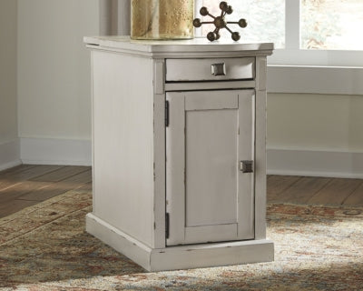 So much form and function in a beautifully compact piece of furniture This richly styled chairside end table puts it all within reach including a flipup top panel revealing a power portperfect for keeping your phone or laptop charged A pullout drink and remote caddy tray are perfect for keeping the top organized Lower cabinet is roomy for keeping essentials hidden Its interior shelf is adjustable giving you more flexibility for storing odds and ends Plus keep magazines out of sight with the magazine file located on the back of the table With an attractive white finish this piece easily complements other furnishings