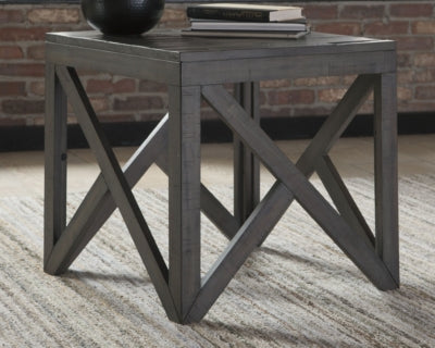 Showcasing a butcher block style top this square end table is a cool commingling of contemporary flair and rustic ease Its complex gray finish is rich with tonal variation for a driftwoody element