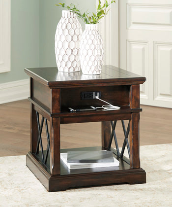 The beauty of this end table will immediately engage you An ideal fit among traditional and eclectic decor its classic profile is elevated with double X side panels and an open cubby with USB and power pluginsperfect for keeping your mobile phone and laptop at the ready