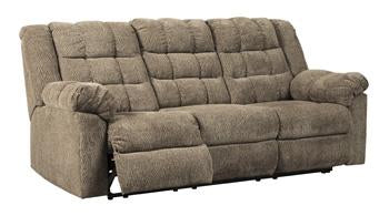 Saddle up for affordably priced luxury with this reclining sofa Stylish elements of this contemporary reclining sofa include biscuit back cushioning and incredibly thick and sumptuous pillow top armrests Ultra neutral and wonderfully plush the warm taupe upholstery is sure to complement an endless array of color schemes Discreetly placed inside arm reclining tab maintains streamlined style
